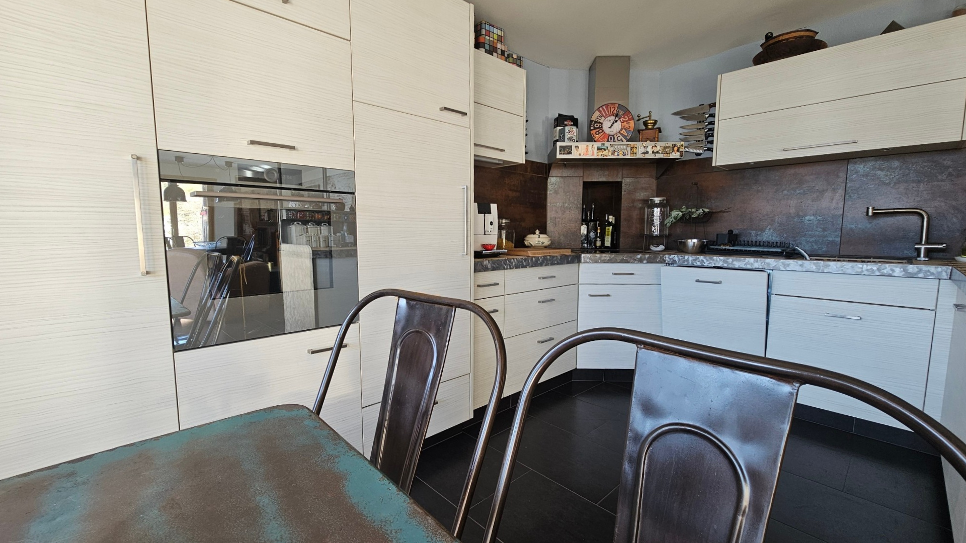 Dès l’entrée, un hall central doté d’armoires murales vous accueille avant de dévoiler une pièce de vie spacieuse, entourée de nombreuses fenêtres ouvrant sur la terrasse et le jardin, où un poêle à bois propose une vraie atmosphère montagnarde. La cuisine, mise en valeur par une verrière élégante qui définit l’espace sans le fermer et offrant un généreux espace pour cuisiner et déguster.