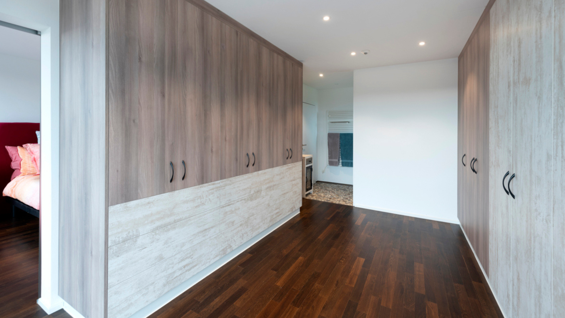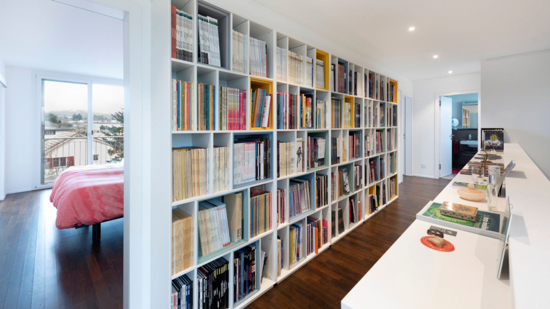 Dès l’entrée, le ton est donné : un vaste hall avec dressing, armoires murales et salle d’eau s’ouvre sur un bureau (ou chambre d’amis) et une superbe pièce de vie baignée de lumière.