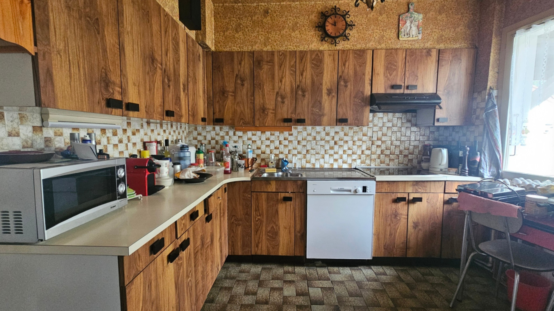 Actuellement, la bâtisse est distribuée en plusieurs espaces : deux appartements (4 pièces et 3 pièces), une chambre ou bureau avec salle d’eau, une cave, une buanderie et un atelier.